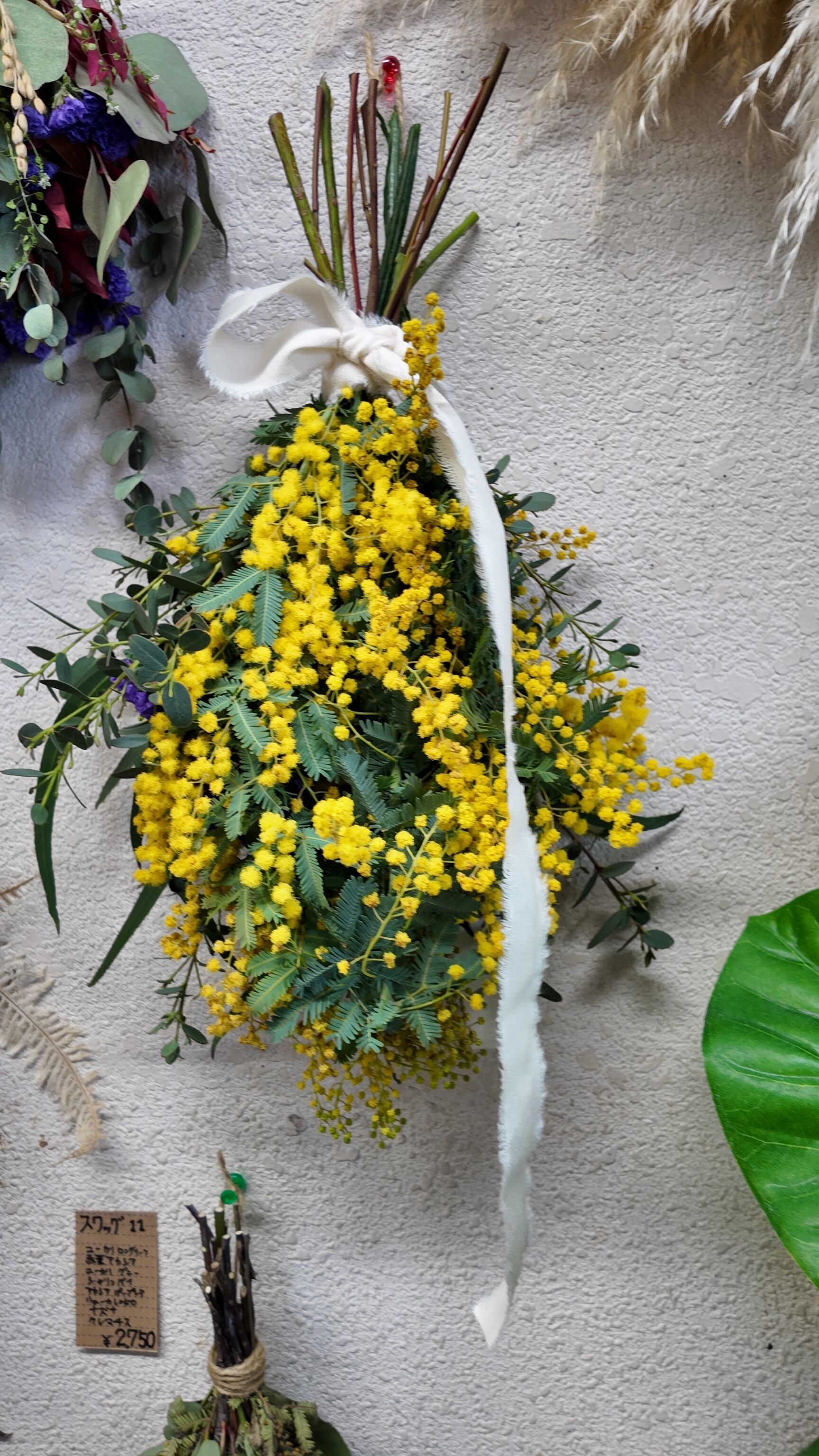 ミモザメインのフレッシュスワッグです。 そえでユーカリを2種類使用しているので香りもとってもいい作品になっています。