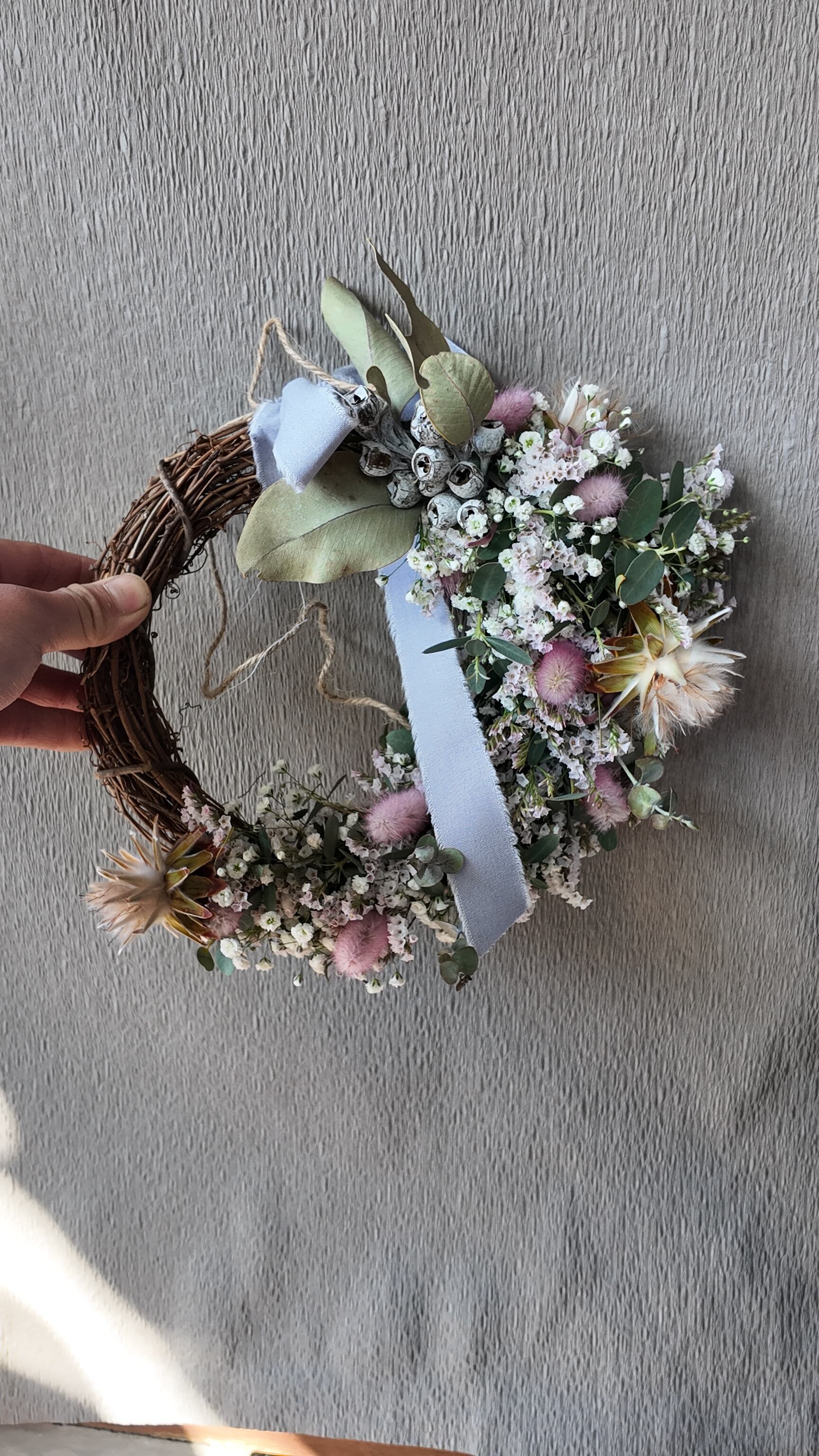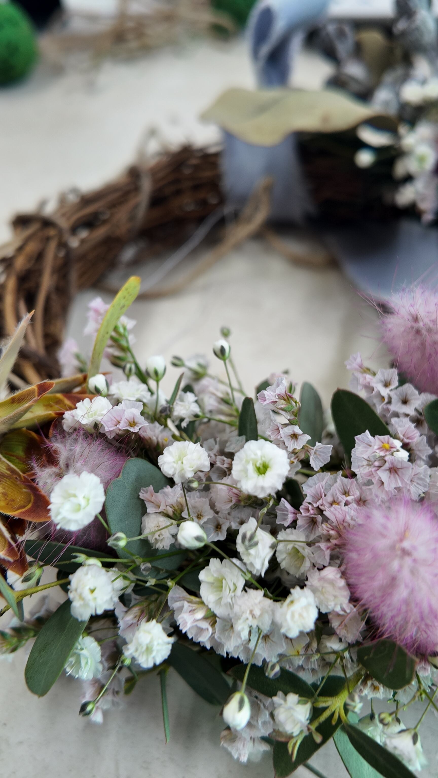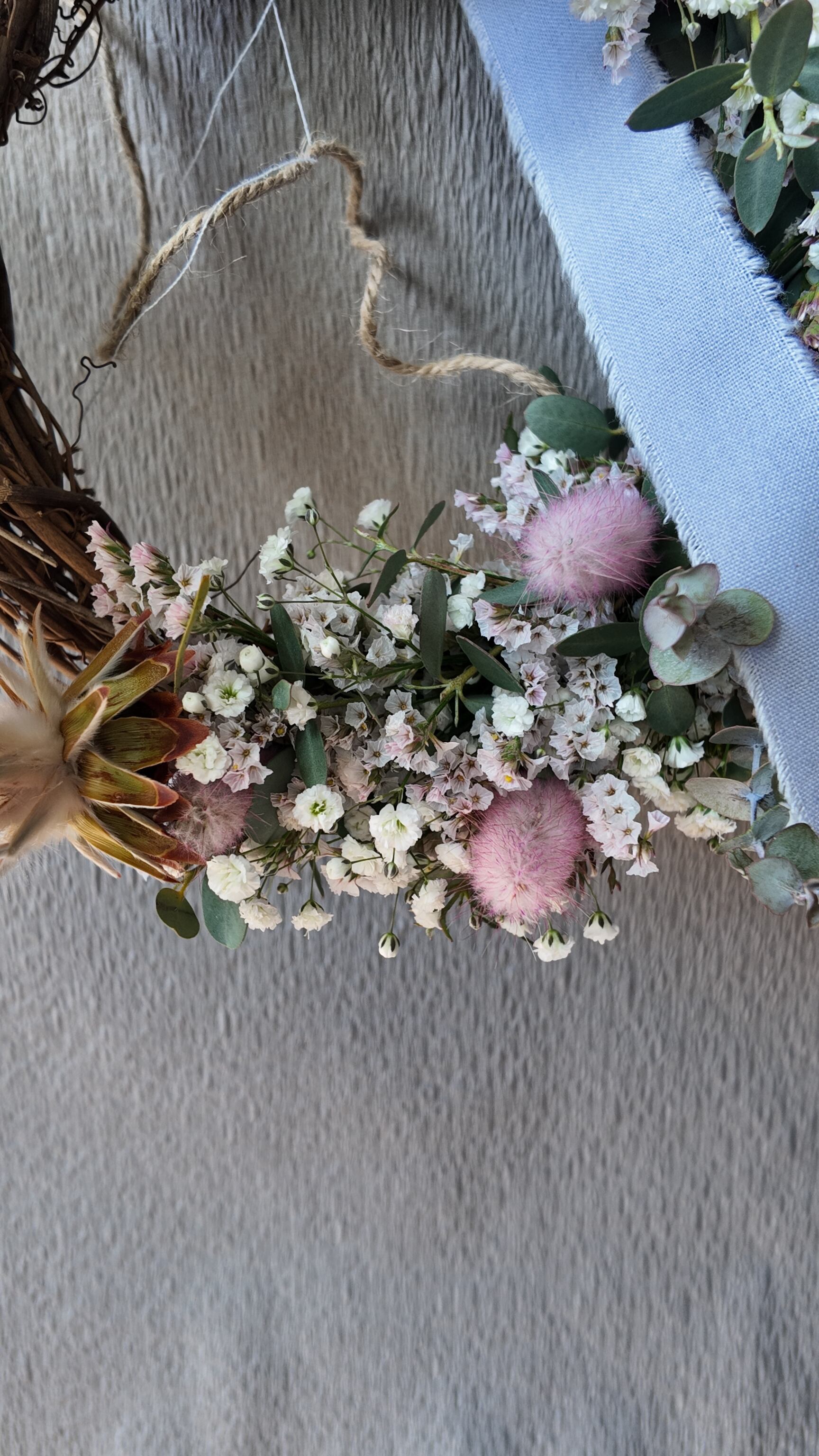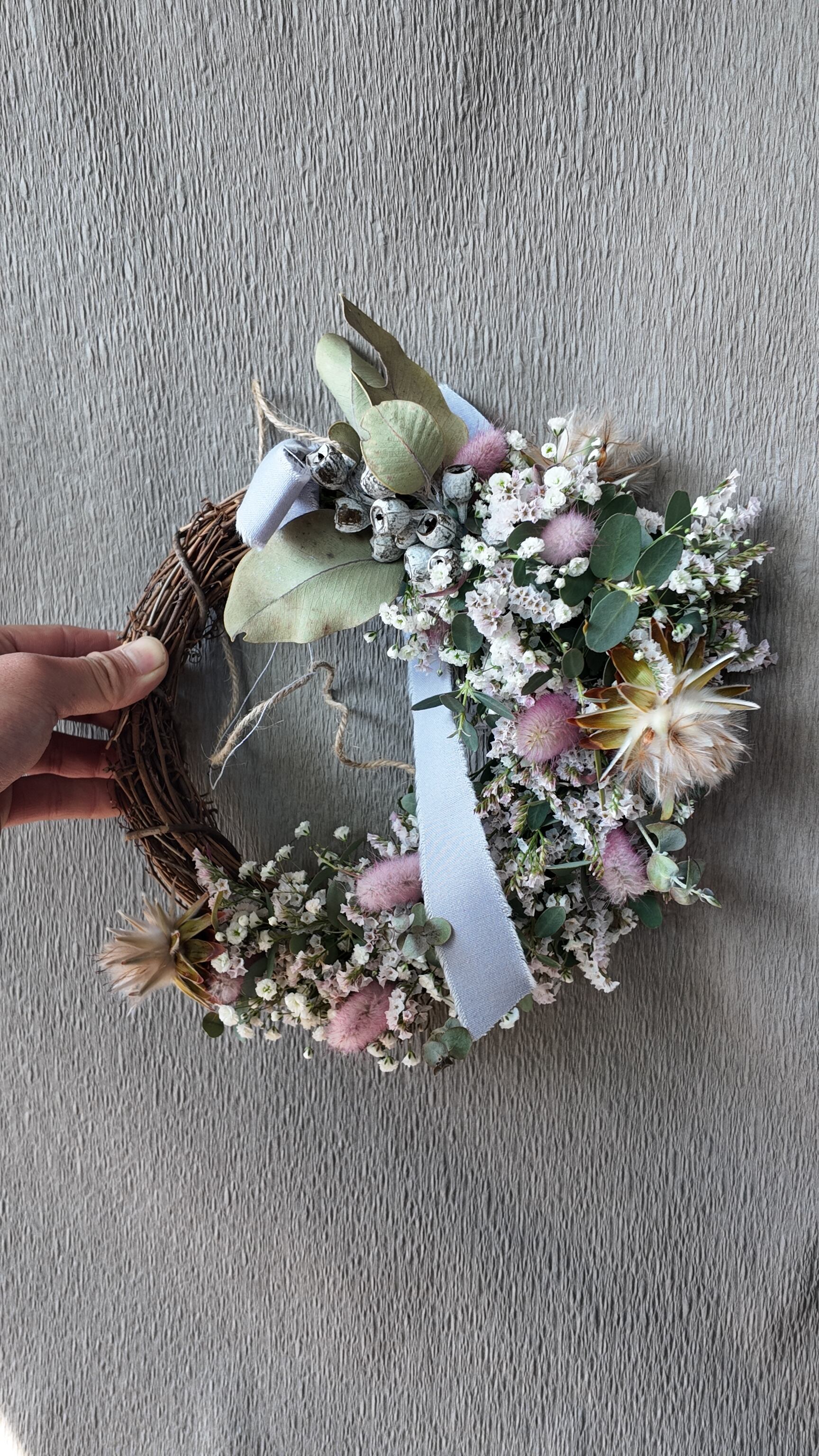 カスミソウとHBスターチスのちらちらと可愛らしさと、ラグラスのピンクがアクセントになったハーフリース。