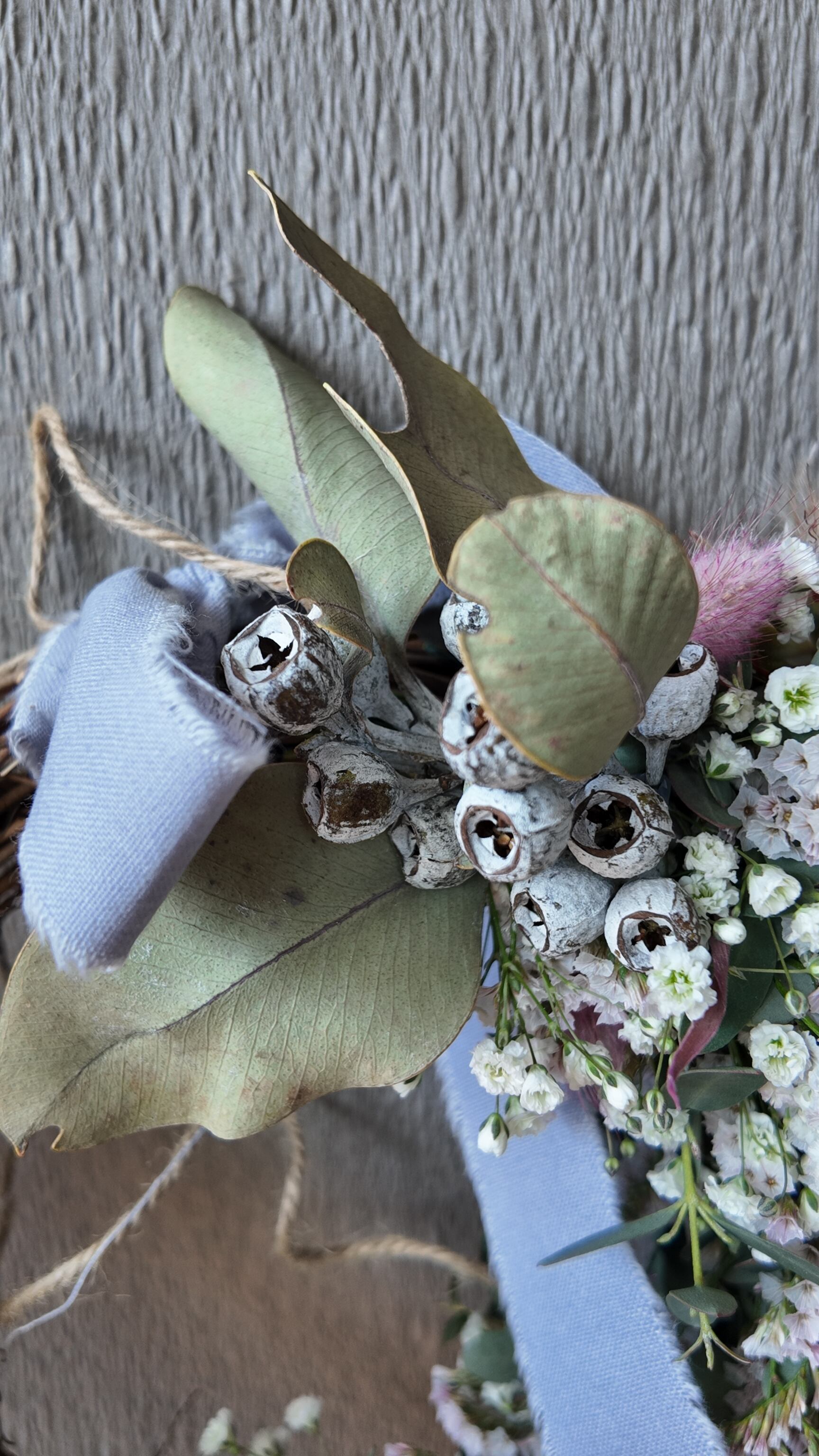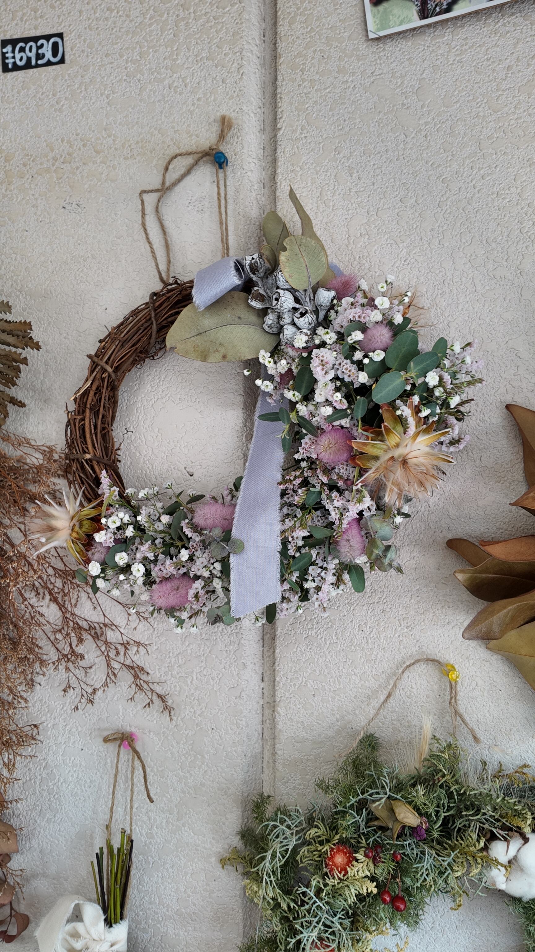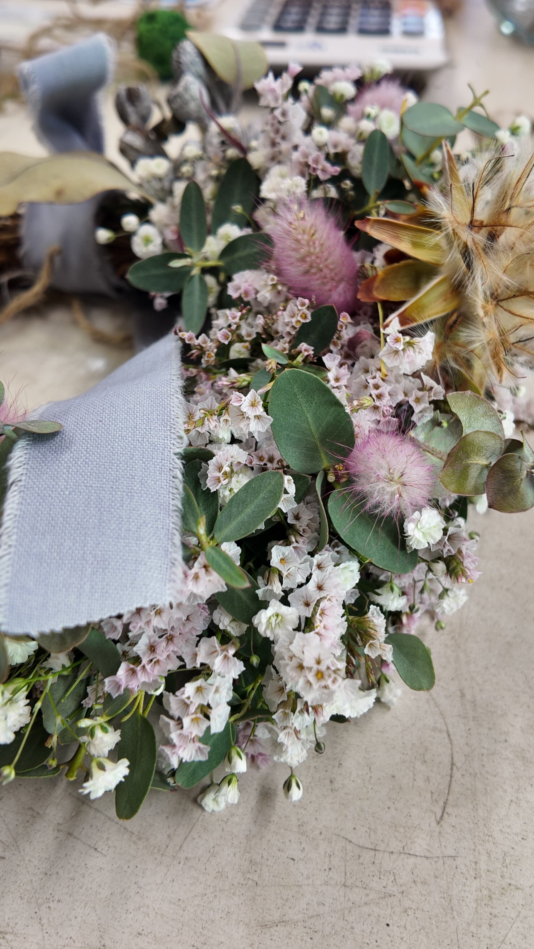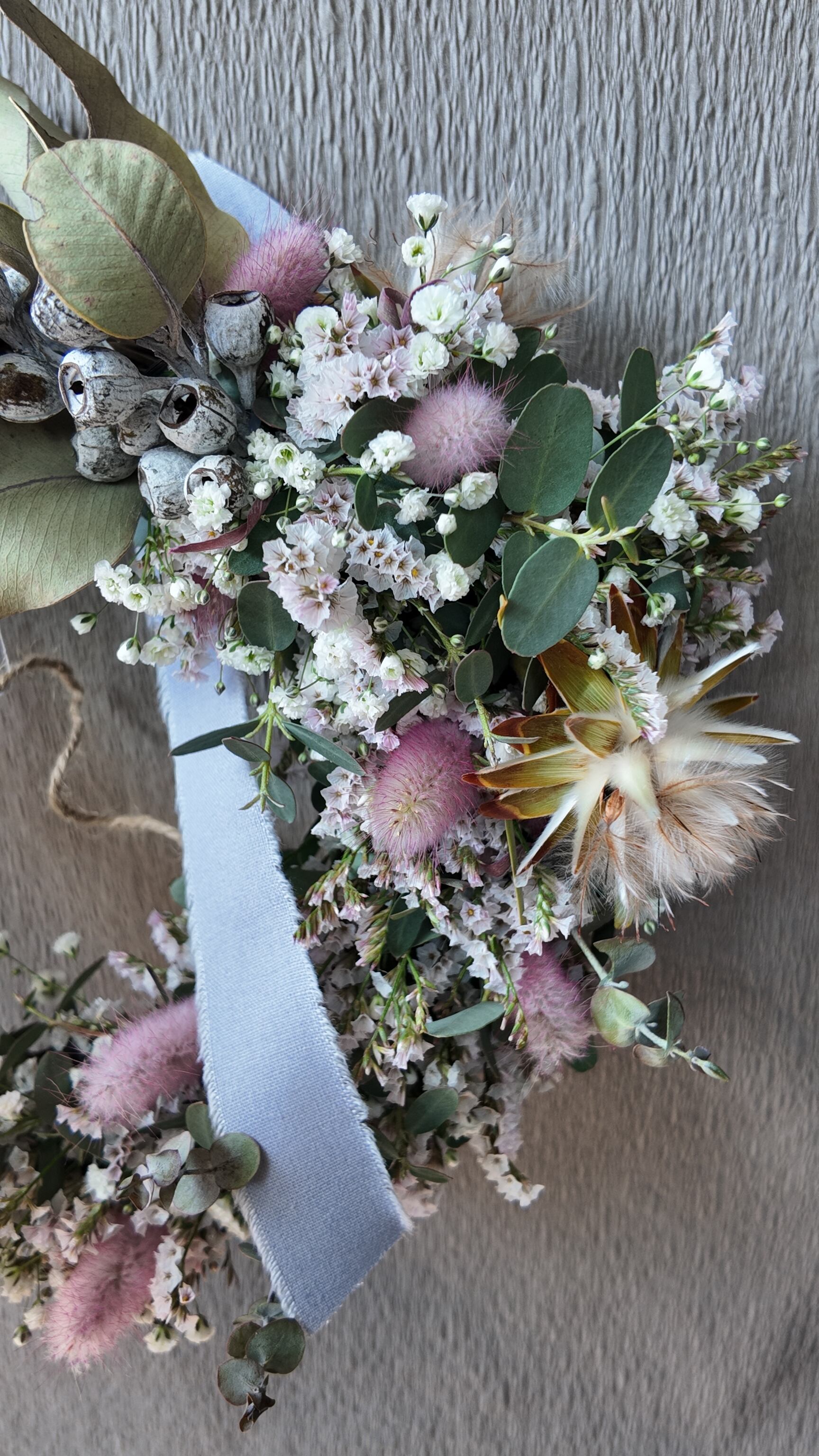 カスミソウとHBスターチスのちらちらと可愛らしさと、ラグラスのピンクがアクセントになったハーフリース。